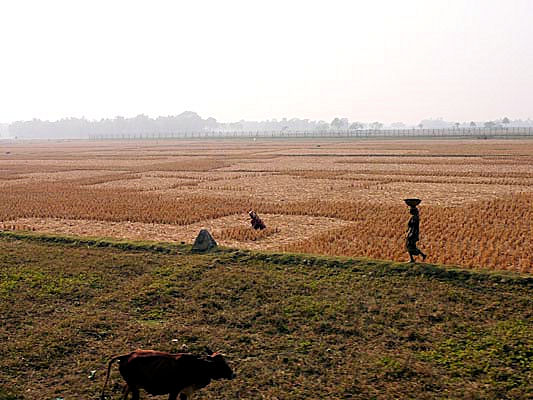 Abb.: सीमा । Grenze mit Grenzstein und Zaun zwischen Bangladesh