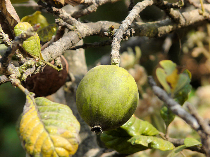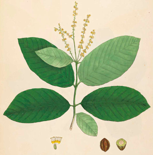 Economic Uses.—The wood of the tree is of no use, not only on account of its softness, but also because it contains much acrid juice, which renders it dangerous to cut down and work upon. The kernels are rarely eaten. The green fruit, well pounded into a pulp, makes good bird-lime. The juice is in general use for marking cotton cloths; the colour is improved and prevented from running by the mixture of a little quicklime and water. The juice is not soluble in water, and only diffusible in spirits of wine. It sinks in expressed oils, but unites perfectly with them.—Roxb."