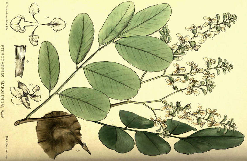 The wood of this tree, is much like that of M. Xylocarpa, and equally serviceable. The flowers are very fragrant. I have often seen large masses of very pure gum upon it."