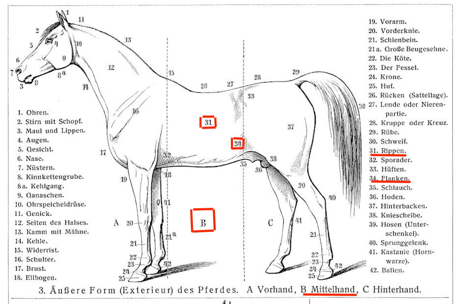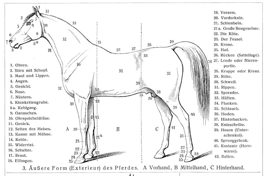 Abb.: घोटकः । Deutsche Nomenklatur für die Körperteile eines Pferdes
