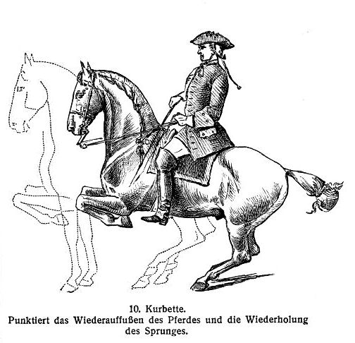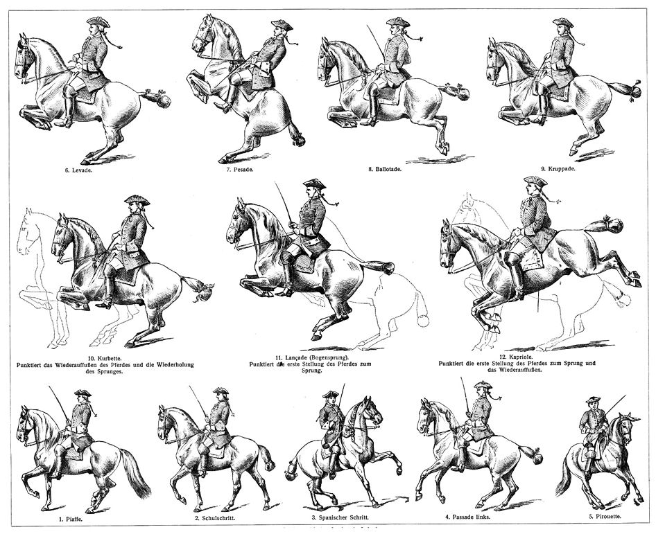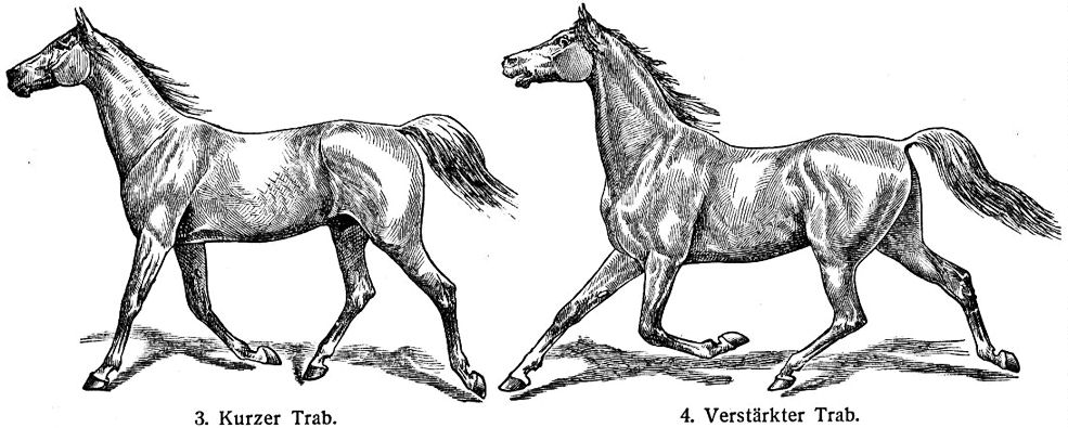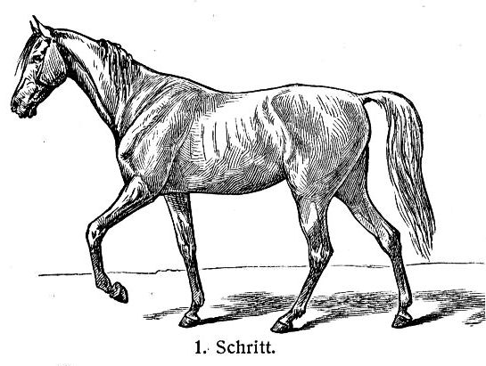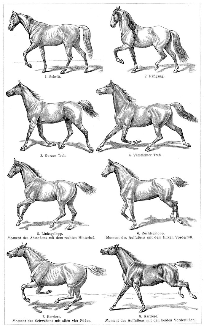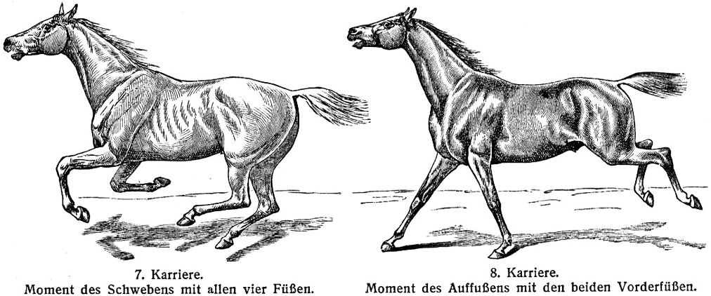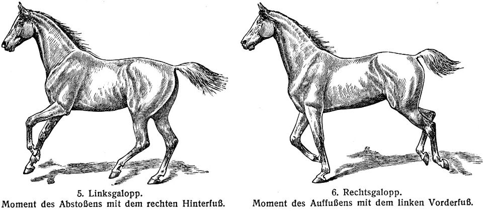 1. rohrgestreckt, 2. wachsend, 3. gedoppelt, 4. springend, indem das eine Vorderbein nach vorne ausgestreckt, das andere zurückgetan und eingebogen ist, 5. ungezwungen dahingehend, 6. kreuzregend – das sind die Arten des Galopps.23
