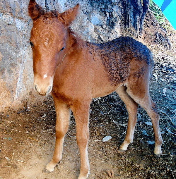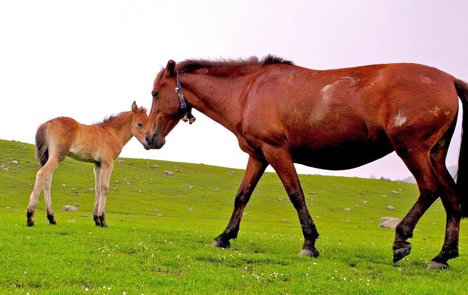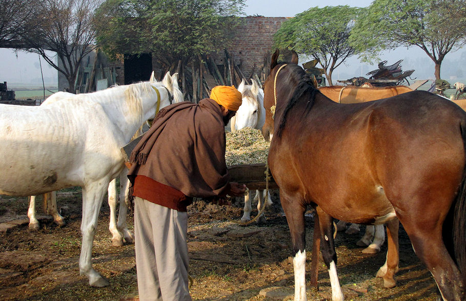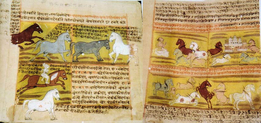 Für die Stute, die eben geboren hat, drei Tage lang ein Trank von einem prastha Schmelzbutter; von da ab zehn Tage lang ein prastha Grütze und als Kräftigungstrank Öl und Arznei, sodann halbgar gedämpfte Getreidekörner (pulāka), Grünfutter9 und die Nahrung, die der Jahreszeit angemessen ist. Vom zehnten Tage an (bekommt) das Füllen einen kuḍumba Grütze mit einem Viertel soviel Schmelzbutter (angemacht) und zu seiner Nahrung einen prastha süße Milch, bis es sechs Monate alt ist. Von da an einen prastha Gerste, der mit jedem Monat um einen halben prastha zunimmt, bis es drei Jahre alt ist; einen droṇa Gerste, bis es vier Jahre zählt.10 Von da ab, als vierjährig oder fünfjährig, ist es arbeitstüchtig und völlig ausgewachsen.