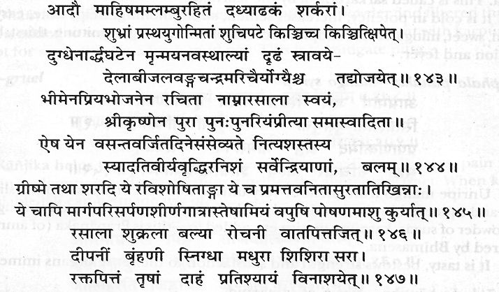 "One āḍhaka of sour curds prepared from buffalos milk devoid of its water, two prastha of clean powdered sugar and half ghaṭa of cows milk are mided well, poured over a thick cloth, tied to the mouth of a fresh mud pot, stirring, slowly over the cloth and thus filtered. Powder of seeds of elā, lavaṅga, candra (karpūra) and marica are added to the fluid and used. This known as Rasālā (sikharana) by name was prepared by Bhīma who was fond of food and consumed again and again by Kṛṣṇa with great pleasure. Now-a-days it is being consumed daily except in vasanta (spring season), since it makes of great increase of vigour, vitality and strength of all sense organs. In grīṣma (summer) and śarat by all who get emaciated by the heat of the sun, who get exhausted/debilitated by too much indulgence in women (sex) who become emaciated by exertion from long distance walk; for these kinds off persons this (rasālā) provides immediate nourishment to the body.