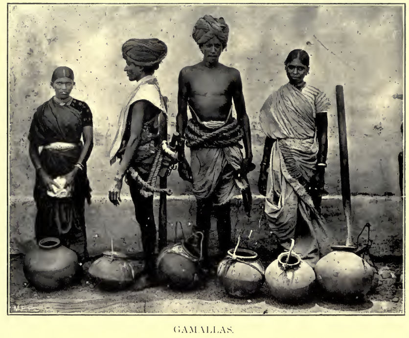 Abb.: Gamallas"Gamalla.—The Gamallas are a class of toddy-drawers, and distillers and vendors of arrack in the Telugu [తెలుగు] country and are supposed to be Īdigas [ఈడిగ] who have bettered themselves, and separated from that caste. Both Gamallas and Īdigas [ఈడిగ] worship the deity Kāttamayya. At the census, 1891, some returned Īdiga [ఈడిగ] as their subdivision. In the Cuddapah district some toddy-drawers style themselves Asilivandlu. Possibly the Īdiga [ఈడిగ] , Gamalla, and Asili toddy-drawing classes only represent three endogamous sections of a single caste. In the Nellore [నెల్లూరు] district, the toddy-drawers style themselves Gamandla or Gavandlavāndlu, and say that they have one gōtra Kaumandlapu or Gaumandlapu. It is probable that the name Gamandla or Gavandla has been coined by Brāhman purōhits [పురోహిత], to connect the caste with Kaumandala Mahārishi of the Purānas. The Gamallas say that they were created to draw toddy by the sage Kavundinya, and that they belong to the Gaundla varnam [వర్ణ] (caste). I am informed that a Purānam [పురాణ], called Gamandla or Gamudi Purānam, has been created. In the social scale, the toddy-drawers appear to occupy a higher position in the Telugu [తెలుగు] than in the Tamil [தமிழ்] country, and they are sometimes said to be Telagas or Balijas [బలిజ], who have adopted toddy-drawing as a profession. The more prosperous members of the community are toddy and arrack (liquor) shop-keepers, and the poorer members extract toddy from the palm-trees.