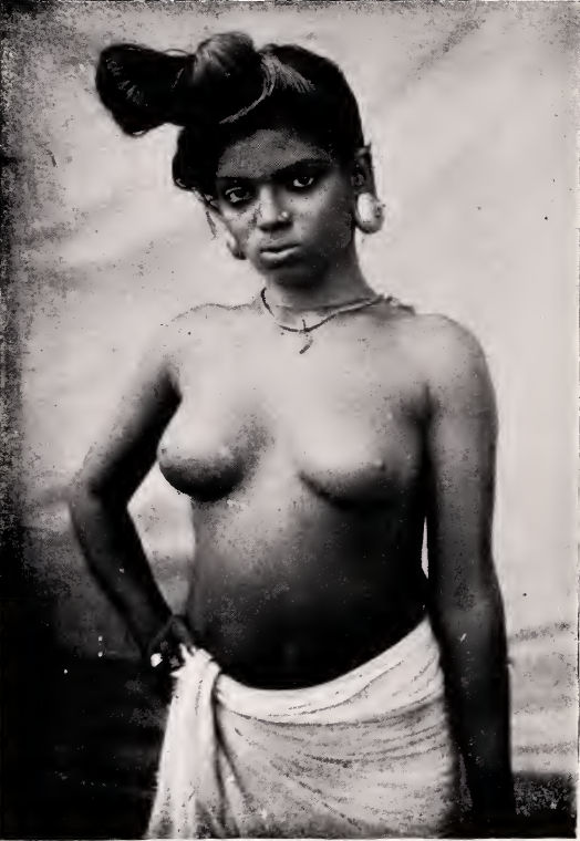 Abb.: Tiya [ടിയാൻ] womanA girl is under pollution for four days from the commencement of the first menstrual period. During this time she must keep to the north side of the house, where she sleeps on a grass mat of a particular kind, in a room festooned with garlands of young cocoanut leaves. Round the mat is a narrow ridge made of paddy (unhusked rice), rice, and flowers of the cocoanut and areca palms. A lamp is kept burning, near which are placed the various articles already described in connection with marriage. Another girl keeps her company and sleeps with her, but she must not touch any other person, tree or plant. She further must not see the sky, and woe betide her if she catches sight of a crow or cat. Her diet must be strictly vegetarian, without salt, tamarinds, or chillies. She is armed against evil spirits with an iron knife carried on her person, or placed on the mat. On the first day, she is seated on a wooden stool in the yard to the east of the house. The fresh spathe of a cocoanut is cut in front of her. The bunch of blossoms is placed in a copper pot painted with perpendicular lines of chunam (lime), and a horizontal line at the top and bottom. The spathe of an areca palm is similarly treated, and, if the contents of both spathes are plentiful, it is regarded as a good augury of fertility. The wife of the girl’s uncle, or, if she is married, her husband’s sister pours some gingelly (Sesamum) oil over her head, on the top of which a gold fanam [പണം] has been placed. Failing such relations, the wife of the Tandān [തണ്ടാൻ] officiates. The operation is repeated by two other women, relatives if possible. The oil is poured from a little cup made from a leaf of the jak tree (Artocarpus integrifolia [Artocarpus heterophyllus Lam.]), flows over the forehead, and is received with the fanam [പണം] in a dish. It is a good omen if the coin falls with the obverse upwards. Rice is cooked with jaggery, and given to the girl. The other women partake thereof, and then have a feast by themselves. The anointing with oil is the only bath the girl has until the fourth day. On the third day, she is not allowed to eat rice in any form, but she may partake of any other grain in the form of cakes. Her uncle’s wife, husband’s sister, and other relations, give her presents of cakes and bread. During the night, the māttu [மாத்து], or cloth-changing ceremony, takes place. First of all, the washerman comes along with the washerwoman, carrying two washed cloths. In the front yard of the house a lamp with an odd number of wicks is burning. In a bamboo basket are a small measure (edangāli) of paddy heaped up on a plantain leaf, a measure of rice on another leaf, two separate quarter measures thereof, a piece of turmeric, a little straw, a piece of coir (cocoanut fibre), and a cocoanut. As soon as he enters, the washerman, using the straw and coir skilfully, makes a bundle of the contents of the basket, and places it near the lamp, which is standing on a wooden stool. A cocoanut is cut in half, and placed, half on each side, by the stool. Thereon is set a flat bell-metal dish, containing a little rice and seven rolls of betel leaves and areca nuts. The washerwoman, having received the māttu [மாத்து] from the woman, places it on his head and proceeds to sing a song, at the conclusion of which he says solemnly three times “Let me place the māttu [மாத்து].” He then places the cloths on the bundle, which is on the stool. The girl’s uncle’s wife, and four other women, have by this time emerged from the middle room of the house, carrying a lighted lamp, a plate with a measure of rice, and a kindi as before. The uncle’s wife, having covered her breast with a silk cloth, and wearing all her ornaments, leads the other four women as they walk thrice round the māttu [மாத்து]. She then places a fanam [പണം] (or a four-anna [അണ] piece) on the māttu [மாத்து], lifts the stool, bundle and all, with one hand on the māttu [மாத்து] and the other below the stool, and leads the procession of the women, with the lamp and other articles, to the room where the girl has been sleeping. She deposits her burden near the spot where the girl has laid her head. A general feast then takes place, and the washerman appropriates the fanam [പണം], and the paddy and rice spread in the yard. So ends the third day of these strange observances. On the fourth day, the girl bathes in a neighbouring pool, with some ceremonial. Before she leaves the house, the washerman fixes in the ground a branch of a certain tree, to the top and bottom of which he ties the two ends of a long line of thin coir rope or yarn. This is supposed to represent the bow of Kāma [കാമദേവൻ], the Indian Cupid. He erects a miniature temple-like structure of young cocoanut leaves, with the stems of young plantains near it, by the side of the pool. Close to it, he places a burning lamp, and a small quantity of rice and paddy, each on a separate plantain leaf. Near them he sets a cocoanut, which has been blackened with charcoal, on some rice spread on a plantain leaf, a cocoanut reddened with turmeric and chunam on raw rice, and another on a leaf, containing fried paddy. (Ordinarily, paddy is partly boiled before it is pounded to remove the husk. Raw rice is obtained by pounding the paddy, which has not undergone any boiling.) He further deposits a few plantains, and two other cocoa-nuts. Before the girl leaves the house, clad in one of the cloths brought on the previous night, she is well rubbed all over with oil, and the four or six women (There must in all be five or seven females) who accompany her are similarly treated. Leading the way, they are followed by a number of women to the pool, where the girl and her companions bathe. After the bath, they stand by the side of the pool, facing east and holding lighted cott