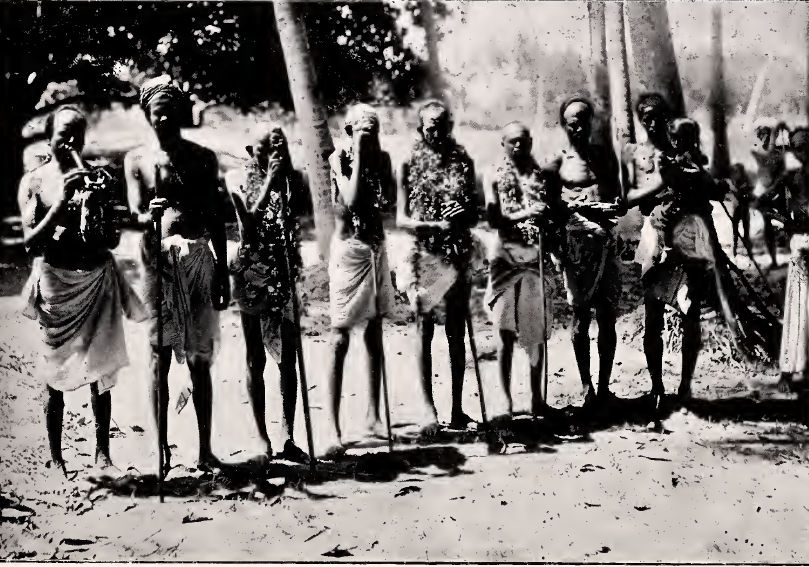 and then wind turbans round the head of the deceased’s heir, in recognition of his new position as chief of the family. When a woman loses her husband, she goes three times round the village mandai (common), with a pot of water on her shoulder. After each of the first two journeys, the barber makes a hole in the pot, and at the end of the third he hurls down the vessel, and cries out an adjuration to the departed spirit to leave the widow and children in peace.”