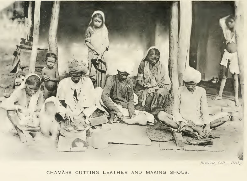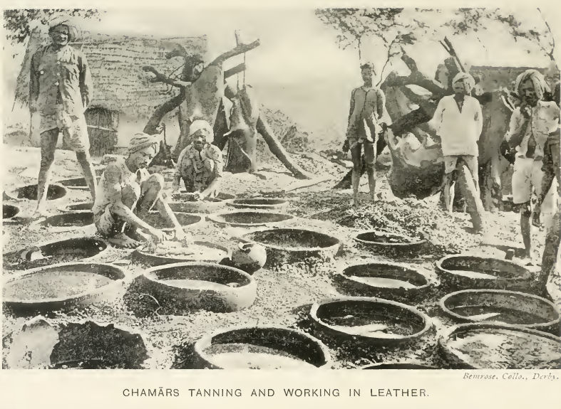 “The industry of tanning is preparatory to and lower than that of cobblery, and hence the caste of Chamār [चमार] ranks decidedly below that of Mochi [मोची]. The ordinary Hindu does not consider the touch of a Mochi [मोची] so impure as that of the Chamār [चमार], and there is a Hindu proverb to the effect that ‘Dried or prepared hide is the same thing as cloth,’ whereas the touch of the raw hide before it has been tanned by the Chamār [चमार] is considered a pollution. The Mochi [मोची] does not eat carrion like the Chamār [चमार], nor does he cat swine’s flesh ; nor does his wife ever practise the much-loathed art of midwifery.”