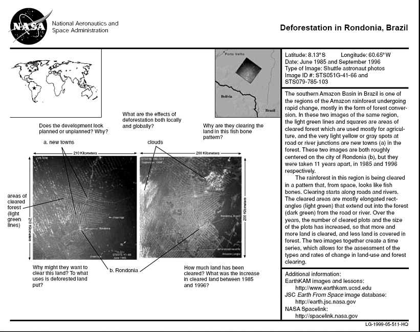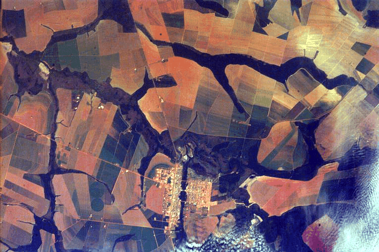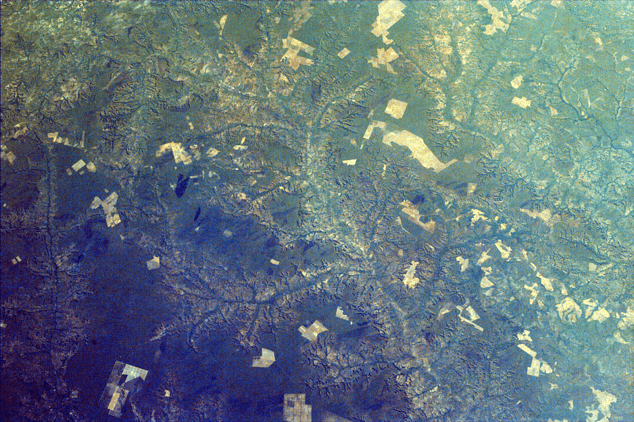 "This picture is from Mato Grosso, a state in western Brazil. This tropical region is an upland plateau that is part of the Amazon River’s watershed. “Mato grosso” means “thick forest” in Portuguese, and the plateau is indeed covered with tropical savannas and rain forests. The state is thinly populated in most regions, and mostly agricultural. Cattle ranching is the primary occupation there, but farming is important as well (as can be seen here). Farmers in Mato Grosso grow beans, rice, and other staples; as well as cash crops such as sugarcane, tobacco, and rubber. The area where this photograph was taken is on the fringes of the plateau, so changes in elevation are beginning to show. Terraces can be seen in the fields here. The area is laced with streams and small rivers, and, throughout the region, rapids become common as the highlands begin to fall off into the low-lying plain. Most of the waterways of Brazil are navigable, but in this remote region, rapids or waterfalls often block boats." [Quelle: http://www.earthkam.ucsd.edu/public/images/bookmarks/ISS005.ESC1.320131406.shtml. -- Zugriff am 2005-12-20]