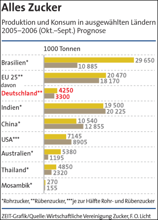 Die zweite noch größere Energie-Ressource kommt aus der Zuckerrohrerzeugung. Inzwischen ist fast jeder zweite Liter Ottokraftstoff in Brasilien Ethanol und kein Benzin. Brasilianisches Ethanol ist bei den derzeitigen Rohölpreisen hoch wettbewerbsfähig. Auch die großen Zuckerfabriken beherrschen die gesamte Kette vom Zuckerrohr-Anbau auf 100000 ha bis zum Vertrieb der Produkte auf den Weltmärkten.Brasilien ist nicht nur führender Agrarexporteur, sondern hat zudem einen großen Inlandsmarkt.