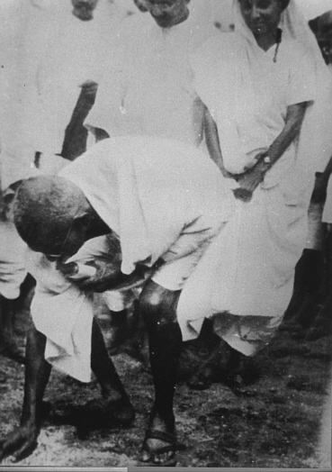 Abb.: Gandhi at Dandi, South Gujarat, picking salt on the beach at the end of the Salt March, 5 April 1930. Behind him is his second son Manilal Gandhi and Mithuben Petit.