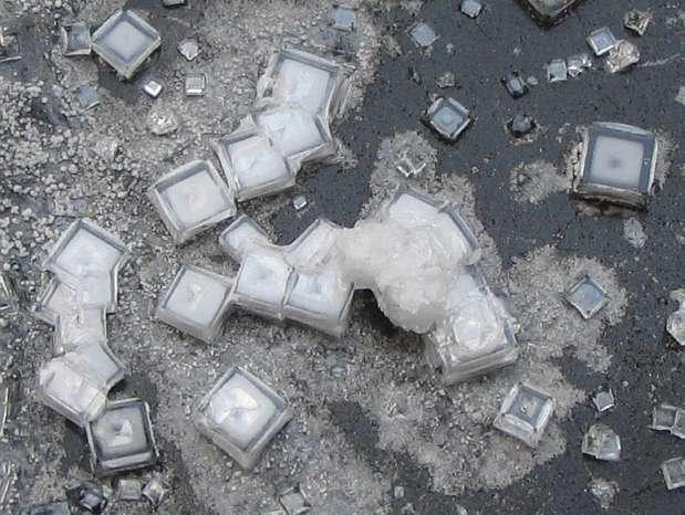 Salz kristallisiert in wasserfreien Würfeln, die gern etwas Mutterlauge einschließen und daher beim Erhitzen zerspringen (verknistern, dekrepitieren). An der Oberfläche der Lösungen entstehende Kristalle sind durchscheinend trübe und lagern sich in Form vierseitiger, innen hohler und treppenförmiger Pyramiden (Fig. 2) aneinander. Klare Würfel entstehen bei freiwilliger Verdunstung einer Salzlösung am Boden des Gefäßes. Unter besondern Verhältnissen entstehen auch Oktaeder und Würfeloktaeder. Bei einer Temperatur unter -10° kristallisiert Salz mit 2 Molekülen Wasser in großen sechsseitigen Tafeln, die beim Erwärmen in Wasser und Würfel zerfallen. Reines Salz wird an der Luft nicht feucht (nimmt aber in feuchter Luft 0,5 Proz. Wasser auf, die es in trockener wieder verliert). Es schmilzt bei 815,4° und verdampft bei höherer Temperatur, namentlich in einem Luftstrom; beim Erstarren kristallisiert es in Würfeln. Sein spezifisches Gewicht ist 2,15. Es ist bei Siedehitze nur wenig löslicher als bei gewöhnlicher Temperatur;