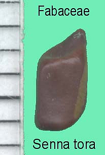 - ""A small erect glabrous shrub; to 90 cm tall; leaves to 7.5 cm long, with 2-4 pairs of obovate, blunt, or minutely mucronate, ciliate-margined leaflets, each 1-4 cm long; a gland on the rachis between the lowest pair (or lower 2 pairs) of leaflets; flowers paired in axils, yellow, about 9 mm broad, on a 6 mm pedicel; 3 of the stamens infertile; pod very slender, linear, somewhat curved, 12-25 cm long, 3-6 mm wide, beaked, membranous, with broad sutures; seeds about 20-30, nearly 3 mm long, brown, flat" (Stone, 1970; p. 311)." [Quelle: http://www.hear.org/Pier/species/senna_tora.htm. -- Zugriff am 2007-07-13]