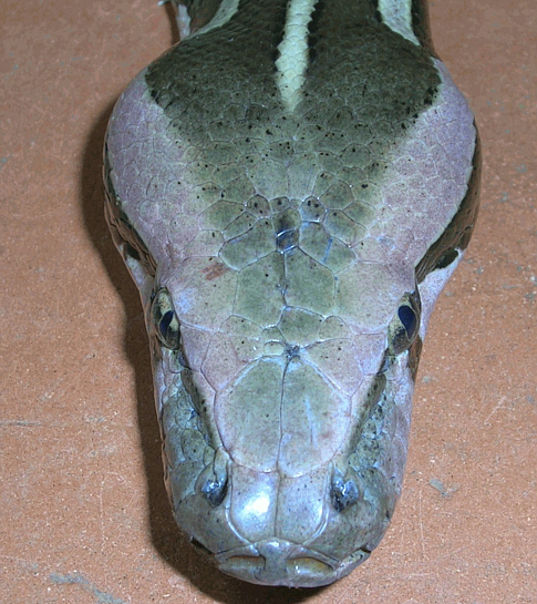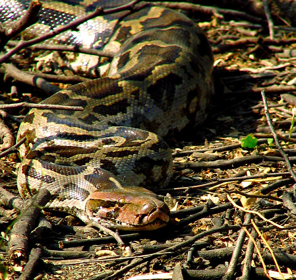 Abb.: Indischer Tigerython = Python molurus molurus, Bharatpur Bird Sanctuary (Keoladeo National Park), Rajasthan (राजस्थान), 2007
