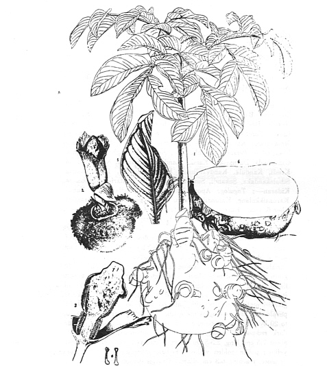 Economic Uses. —The roots are very nutritious, on which account they are much cultivated for the purpose of diet. They are planted in May, and will yield from 100 to 250 maunds per beegah, selling at the rate of a rupee a maund. The roots are also used for pickling. Wight says that " when in flower the fetor it exhales is most overpowering, and so perfectly resembles that of carrion as to induce flies to cover the club of the spadix with their eggs." A very rich soil, repeatedly ploughed, suits it best. The small tuberosities found in the large roots are employed for sots, and planted in the manner of potatoes. In twelve months they are reckoned fit to be taken up for use; the larger roots will then weigh from 4-8 or more pounds, and keep well if preserved dry. The natives employ them for food in the manner of the common yam. The plant is the Chaneh or Mullum chaneh of Rheede.—Jury Rep. M. E. Roxb."