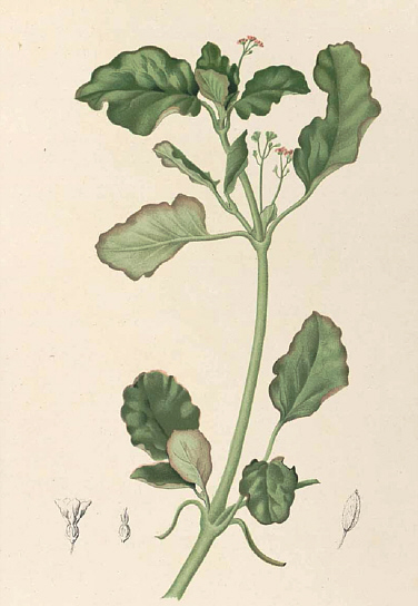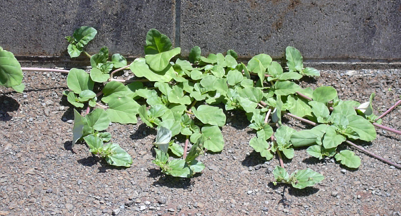 Description. — Low creeping plant with many diffused stalks, about two feet long ; flowers pale rose-coloured, much scattered on long branching peduncles from the axils and at the end of the branches; seeds brown, oblong, striated, very rough ; leaves ovate, rather roundish, bright green above, whitish below ; sometimes curled at the edges. Fl. All the year.—Roxb. Fl. Ind. i. 146.—Rheede, vii. t. 56.—Wight Icon. t. 874.-------Coromandel. Travancore. India generally.