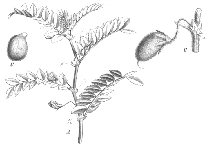 Description.—Herbaceous, annual plant; calyx 5-lobed, scarcely gibbous, segment as long as the alae of the corolla; leaves unequally pinnated; leaflets ovate, serrated, equal; stipules lanceolate, somewhat toothed; corolla papilionaceous; flowers axillary, bluish purple; legumes hairy. Fl. Sept.—Oct.—W. & A . Prod. i. 235.—Roxb. Fl. Ind. iii. 324— Wight Icon. t. 20.-------Cultivated.