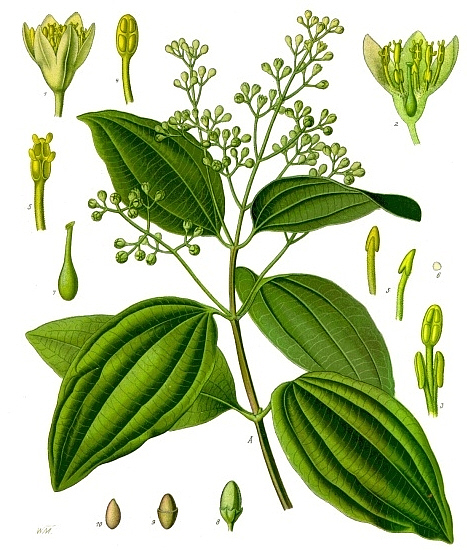 Beschreibung. Gegen 10 (nach Karaten bis 20) Meter hoher, mit immergrünen Blättern besetzter Baum — in der Kulturform strauchartig — mit zylindrischen älteren und stumpf vierkantigen jüngeren Ästen, die mit einer aromatischen braunen oder grauen, jung grauen, kahlen Binde bedeckt sind. Blätter paarweise einander gegenüberstehend, wagerecht abstehend oder etwas abwärts geneigt, im Anfange scharlachrot, dann oberseits glänzend grün, unterseits graugrün, derb-lederig, 12 cm. lang, 5 cm. breit (nach Flückiger bis 23:8 cm.), in Form und Größe sehr veränderlich, im Allgemeinen von eiförmigem Umrisse, stumpf oder kurz gespitzt, ganzrandig, handförmig 8—5(7)nervig, mit zwischenliegendem, die Hauptnerven rechtwinklig verbindendem Adernetze. Die Seitennerven aus der Basis oder oberhalb derselben entspringend. Die Blätter haben einen süßen Geschmack und entwickeln beim Zerreiben einen gewürznelkenartigen Geruch. Die zwitterigen, weißgrünlichen, angenehm riechenden, unscheinbaren Blüten in schlanken, achsel- and endständigen, umfangreichen Rispen mit vierseitiger, im oberen Teile schwach seidenhaariger, sich erst über der Mitte verzweigender Spindel, die letzten Äste 3-, selten 5—7blüthig. Die weißlichen, schwach seidenhaarigen Blütenstielchen abstehend. Die kleinen, schmal-lanzettlichen Deckblätter bald abfallend. Perigonblätter zu 6, zweireihig aus dem äußersten Rande des fleischigen, kreiselartigen Unterkelches hervorgehend, 4 Mm. lang, weißlich seidenhaarig, oval, abgestumpft, etwas fleischig, adernervig, durchscheinend punktiert, oberhalb der Basis mit einer Querlinie und hier der obere Teil später abfallend. Staubgefässe 12 in 4 Reihen, die 9 äußeren, fast perigonlangen fruchtbar, die 3 innersten (Staminodien) kürzer, unfruchtbar. Von den dicken, feinbehaarten Staubfäden sind die 6 äußeren nackt, die 3 inneren, am Grunde breiteren mit beiderseits je einer gelben Drüse besetzt. Die gelben Staubbeutel länglich, stampf 4kantig, oben ausgerandet, 4fächerig. Fächer einseitig, paarweise übereinander liegend, mit aufsteigenden Klappen sich öffnend. Staminodien mit herzförmigen, zugespitzten Köpfchen. Pollen kugelig. Der freie, kahle Stängel etwas kürzer als die Staubgefässe, mit eiförmigem, in die Höhle des Unterkelches eingesenktem, einfächerigem, eineiigem Fruchtknoten, etwas übergeneigtem, an der eingebogenen Seite rinnigem Griffel und nierenförmiger Narbe. Eichen hängend. Die beerenartige, eiförmig-längliche, sehr kurz stachelspitzige Frucht von dem anwachsenden Unterkelch bis zur Mitte becherförmig eingeschlossen, mit wachholderartigem Geschmack. Der eiweißlose Same von der Form der Beere, mit plankonvexen Samenlappen und nach oben gerichtetem Würzelchen.