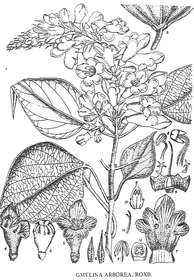 Carakasaṃhitā: Ausgewählte Texte aus der Carakasaṃhitā / übersetzt und erläutert von Alois Payer <1944 - >. -- Anhang A: Pflanzenbeschreibungen. -- Gmelina arborea Roxb. -- Fassung vom 2007-07-27. -- URL: http://www.payer.de/ayurveda/pflanzen/gmelina_arborea.htm
