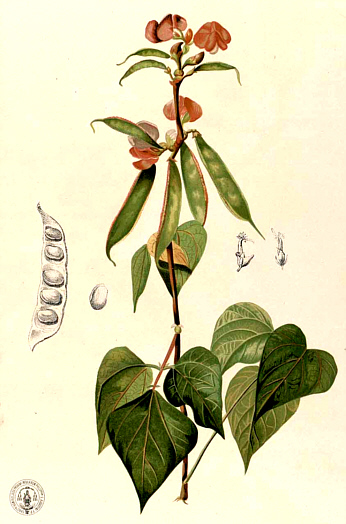 Description.—Twining; leaves pinnately trifoliolate; leaflets entire; racemes axillary, elongated; pedicels short; corolla papilionaceous; calyx bi-bracteolate, campanulate, tubular 4-cleft; legume broadly scimitar-shaped, gibbous below the apex, and ending abruptly in a straight or recurved cuspidate point; seeds longitudinally oval, of various colours; flowers red, purple, or white. Fl. Nov.—Feb.—W. & A. Prod. i. 250. Wight Icon. t. 57-203.—Roxb. Fl. Ind. iii. 305.-Dolichos lablab, Linn.------Peninsula. Bengal. Cultivated.