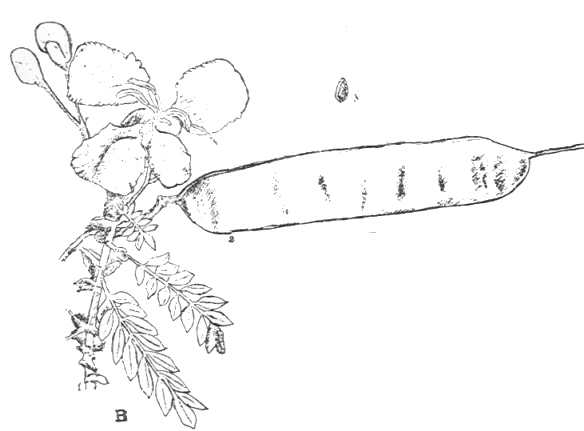 Description.—Shrub; young branches, petioles, and peduncles pubescent; leaflets 8-12 pairs, with a gland between each pair, oval, obtuse or retuse, mucronate, upper side glabrous, under slightly pubescent; racemes axillary, nearly as long as the leaves, many-flowered, approximated towards the ends of the branches; pedicels compressed; sepals slightly hairy; legumes compressed, straight; flowers 3-5 together, bright yellow. Ft. Oct.—Dec.— W. & A. Prod. i. 290.—Senna auriculata, Roxb. Flor. Ind. ii. 349.-----Common in the Peninsula.
