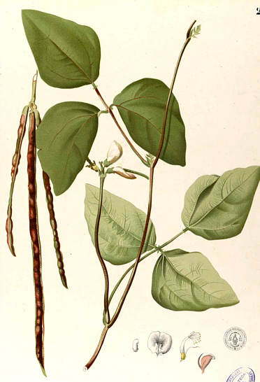 Description.—Twining annual, glabrous; leaves pinnately trifoliolate; leaflets ovate or oblong, acuminated; peduncles longer than the leaves; flowers in an oblong head or short raceme; calyx campanulate, 5-toothed; lowest one longer than the rest; legume nearly straight, cylindric, torulose, with a more or less recurved unguiculate beak, 6-12 seeded; seeds truncated at both ends; flowers largish, pale violet. Fl. June —Aug.—W. & A. Prod. i. 250—Roxb. Fl. Ind. iii 302.— Rheede, viii. t. 42.-------Cultivated in the Peninsula.