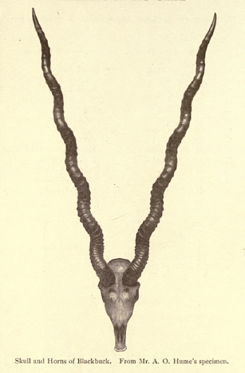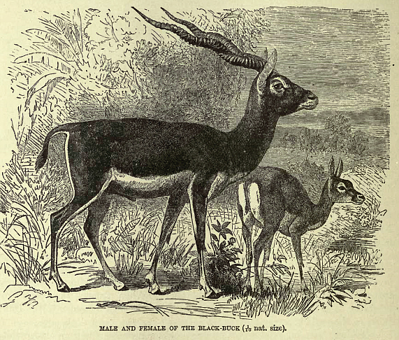 The black-buck is an inhabitant of open plains from the foot of the Himalaya nearly to Cape Comorin, and from the Punjab to Lower Assam ; and is most abundant in the North-West Provinces, Rajputana, and portions of the Deccan. It frequents either grassy districts or cultivated lands, and is generally found in herds, which may comprise hundreds or even thousands of individuals, but more usually number from ten to thirty, or even fifty does, accompanied by a single old buck. Mr. Blanford states that frequently "two or three younger bucks, coloured like the does, remain with the latter, but these young males are sometimes driven away by older bucks, and form separate herds. This antelope never enters forest nor high grass, and is but rarely seen amongst bushes. When not much pursued or fired at, it will often allow men to come in the open within about one hundred and fifty yards, sometimes nearer."Carts and natives can approach still closer. The black-buck feeds at all hours, although it generally rests during the middle of the day. In certain districts, where there is no fresh water except in deep wells, it is certain that these animals never drink ; but several observers have proved that in other places they, at least occasionally, drink freely. Like the springbok, the black-buck frequently leaps high in the air when running. The speed and endurance of these animals are well known ; and it is but very seldom that they are pulled down on good ground by greyhounds. In heavy sand, or on soft ground during the rains, they are, however, easily overtaken by good dogs ; and wounded buck may be ridden down. An account of black-buck coursing with the hunting-leopard will be found on p. 445 of the first volume ; and antelope-stalking is a favourite Indian sport.