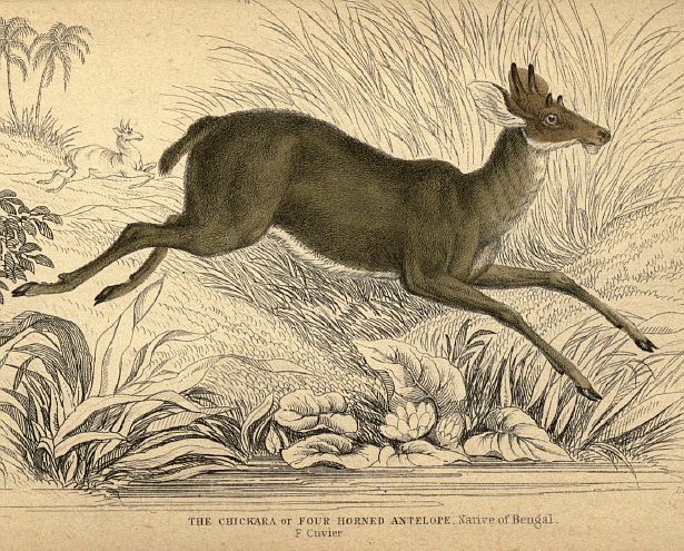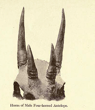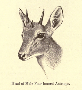"Genus TETRACERUS, Leach (1825). Size small. A muffle present. An elongate suborbital gland ; interdigital glands confined to the hind feet. No inguinal glands. Hoofs small, rounded in front. Tail short. Mammae 4. Frontal and parietal profile of skull slightly and gently rounded, the occipital meeting the parietal at a right angle. Lachrymal fossa large. Horns in the male only, usually 4 in number in adults ; all the horns short, conical, smooth, the posterior pair much longer than the anterior, which are situated between the orbits, are often mere knobs and are not unfreqnentiy wanting. Jerdon's statement that there are canines in the males is a mistake. There is a single species peculiar to India. This is the only Indian representative of the Cephalophine antelopes of Africa or Duikerboks. Remains of T. quadricornis are found fossil in the Pleistocene cave-deposits of Kurnool, and a small Siwalik ruminant is referred to this genus. Tetracerns quadricornis. The four-homed Antelope. Antilope (Cervicapra)