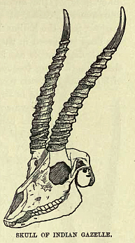 Fig. 171. Skull and horns of Gazella bennetti.Skull resembling that of Antilope, but shorter in proportion. Nasals short. Lachrymal fossa variable: a distinct lachrymal fissure. Auditory bullae large. Horns sometimes in both sexes, those of the male compressed, oval in section, erect, with a more or less marked siginoid curve, sublyrate or lyrate, surrounded by subdistant prominent rings almost throughout.