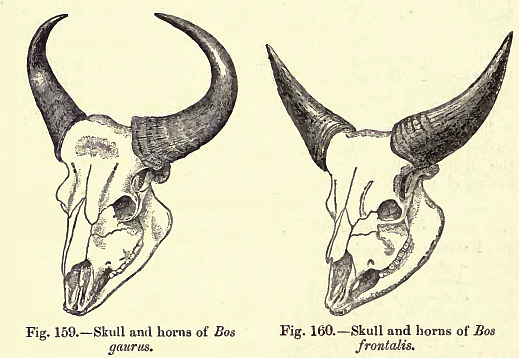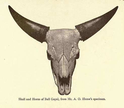 Gavseus frontalis, Hodgson, J. A. S. B. xvi, p. 705 ; Horsfield, Cat. p. 179 ; Blyth, J. A. S. B. xxix, p. 291 ; id. Cat. p. 162.Gāyāl, H. ; Mithan, Bunerea-goru, Gavior Gobi, Assam and Chittagong ; Sandung, Manipuri ; Shel, Shio, Kuki ; Jhongnua, Mugh ; Bui-sang, Hut, Naga ; Phu, Aka ; Siba, Daphla ; Nuni, Tsaing, Burmese.