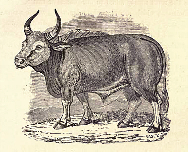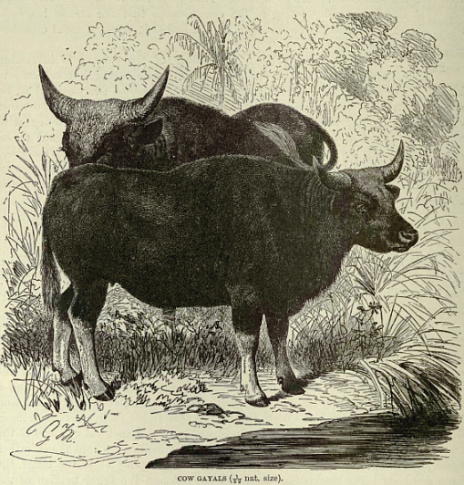 Gavaeus gaurus, Blyth, J. A. S. B. xxix, p. 282; id. Cat. p. 161 ; Jerdon, Mam. p. 301.Gaur, Gauri-gai, H. ; Gāyāl, in Orissa, &c. ; Gaor (male) , Gaib (fem.) , in Chutia Nagpur (commonly Ban-boda, Ban-parra, Ran-hila, Ran-pado, Jangli-khulga, and even Ban-bhainsa and Arna, all signifying wild buffalo, in various parts of the Peninsula) ; Sainal, Hokol ; Gaviya, Mahr. ; Pera-Mao, Gond. in the South ; Katu-erimai, Tarn. ; Karkona, Karti, Kardyemme, Kard-korna, Doddu, Can. ; Karthu, Paothu, Mal. ; Mithan, Assam ; Seloi, Chittagong ; Pyoung, Burmese ; Saladang, Malay. The Bison or Indian Bison of European sportsmen.