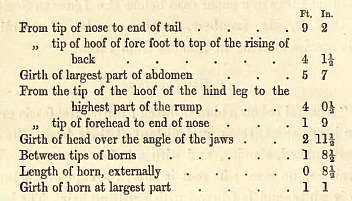 Dimensions. This appears to be the largest of existing bovines. Large bulls are said to exceed 6 feet in height at the shoulder, but this is rare and exceptional, 5 ft. 8 in. to 5 ft. 10 in. being the usual height. Cows are much smaller, about 5 ft. high. A huge bull measured by Elliot was 6 ft. 1½ in. high, 9 ft. 6 in. from nose to root of tail, tail 2 ft. 10 in. long, girth behind shoulders 8 ft. A cow 4 ft. 10½ in. high measured 7 feet from nose to rump over curves, and 6 ft. 9 in. in girth. A large male skull from the Western Ghats measures 18 inches in basal length and 9.9 in zygomatic breadth. Average male horns measure 20 to 24 inches round the outside curve. Horns from Travancore have been recorded 39 inches in length and 19 inches in girth at the base ; whilst other Travancore horns measure 20-75 in girth, and a pair from the Malay Peninsula 22, though only 32 long. Large cows' horns measure 23 and 24 round the outside curve, with a girth of 13.25. The girth of each horn in freshly killed specimens is about an inch more than in dried skulls.