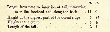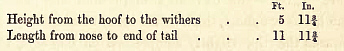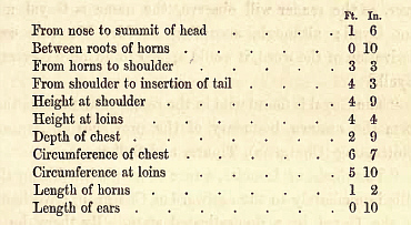 mane on the dewlap, and into a pencil-like tuft on the end of the tail. From the summit of the head there diverges, with a whirl, a bunch of rather long coarse hair, which lies flat, is usually lighter-coloured than that which is adjacent, and extends towards the horns and over the forehead. The general colour of the animal is brown, in various shades, which very often approaches to black, but sometimes is rather light. Some parts, especially about the legs and belly, are usually white ; but in different individuals these are very differently disposed."The following is the measurement of a full-grown cow: