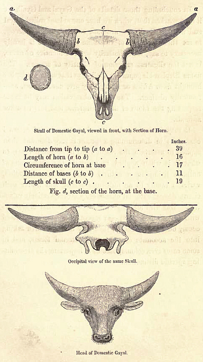 Of the Gayal (Bos Gavaeas of Colebrooke) there appears to be more than one species. The provinces of Chatgong and Sylhet produce the wild, or, as the Natives term it, the Asseel Gayal, and the domesticated one. The former is considered an untameable animal, extremely fierce, and not to be taken alive. It rarely quits the mountain tract of the south-east frontier, and never mixes with the Gobbay, or village Gayal of the plains. I succeeded in obtaining the skin, with the head, of the Asseel Gayal, which is deposited in the Museum of the Hon. East-India Company, in Leadenhall Street." [A drawing was taken of this head, of which the engraving on the opposite page is a copy.]"