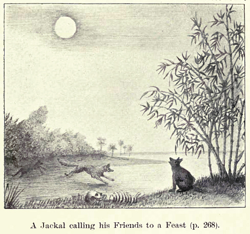 The jackal's night-cry, the wild chorus with which the band begins its hungry prowl, is of evil omen, which is wonderful, seeing that in nearly every town and village of the vast continent it is heard about the same hour of the evening ; but it is believed that when the cry is raised near the house of a sick person, it is a sure presage of death, and that jackals scent coming dissolution, much as sharks are said by sailors to scent death on a ship. There are endless stories in favour of this belief.