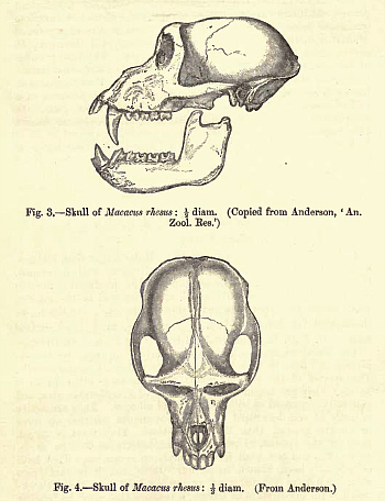 may frequently be seen carefully searching the ground for these delicacies. Mr. Blanford tells us that the rhesus, like the crab-eating macaque, swims well, and takes readily to the water.Professor Ball relates a curious anecdote of these monkeys : "