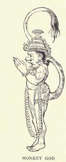 R. K.of the respect in which these animals are held by Hindus is a reflection of the popularity of Hanuman, or (in Southern India) of Maruti, the monkey general of the great Hindu epic the devoted henchman of Ram Chandra, and a marvel of valour and address combined with gentleness. He has now become a god, and is one of the most widely worshipped of Hindu deities. Pictures and rude images are to be seen of him everywhere, but he is not represented in the more ancient Hindu sculptures. A notion exists among Hindus that the English may be his descendants through a female servant of the demon king, who had charge of Sita in captivity, and who treated the prisoner so well that Rama blessed her, prophesying that she should become the mother of a race that would possess the land, and whom Hanuman took to wife. This can scarcely be made out from the poem, but the tradition exists. Others, again, say that the English came from the "monkey army," which unlovely phrase is occasionally used to describe the British nation.