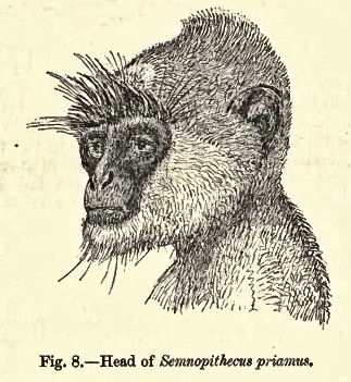 In all the species the thumb is well developed ; this being a character of great importance, as the chief one by which these monkeys are distinguished from some closely allied African monkeys. The row of long stiff black hairs seen in our figure, projecting from above the eyebrows of the langurs, is another feature by which these monkeys