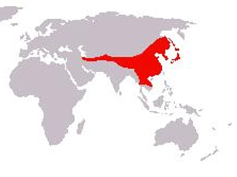 Distribution. This bear is found throughout the forest-regions of the Himalayas, extending westward through parts of Afghanistan into Baluchistan and the Khirthar range on the west frontier of Sind. The western limits are about the frontier of. Persia, to the eastward U. torquatus is found in the Assam ranges and some of the countries to the southward, being certainly found, though not common, in Pegu, where it was obtained by Theobald, and as far south as Mergui, whence Dr. Anderson obtained living specimens for the Calcutta Zoological Gardens. It also occurs in Southern China, Hainan, and Formosa. "Whether the bear found in the plains of Eastern Bengal and Assam is this species or the sloth-bear, I cannot state positively. I once saw a skin of U. torquatus obtained from an animal that I was assured had been shot in Lower Bengal; and a writer in the 'Asian 'of January 21st, 1888, states that he shot one in the Terai, close to the Patli Dun, North-west Provinces.