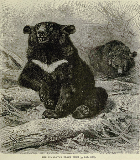With the black bear of the Himalaya we come to a very different animal, readily recognised by the white chevron or inverted crescent on the chest, from which it takes its scientific title, and which stands out in marked contrast to the jetty black of the remainder of the fur. This species does not attain by any means such large dimensions as the brown or grizzly bear ; the length from the tip of the snout to the root of the tail usually averaging in Nipalese examples from about 4¾ to 5½ feet, although one specimen has been recorded measuring 6 feet 5 inches. We think, however, that bears of this species from Kashmir would average somewhat larger.