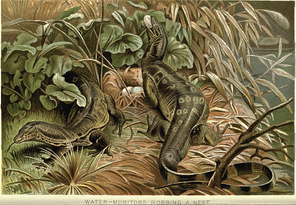 From observations made on specimens in captivity, it appears that these lizards eat eggs by taking them in their mouths, raising their heads, and then breaking the shells, so that the contents are allowed to run down their throats. Although but little is ascertained regarding their breeding-habits, monitors are known to lay white, soft-shelled eggs, which are deposited sometimes in the nests of white ants. As many as twenty-four eggs, of a couple of inches in length, have been taken from the body of a single female. By the Burmese these eggs are much relished as articles of food, and command a higher price in the market than hens' eggs."