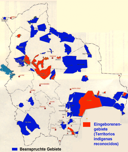 Abb.: Eingeborenengebiete (Territorios indígenas reconocidos) und von Eingeborenen 1996 und später beanspruchte Gebiete