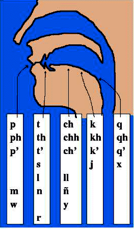 Aymara-Alphabet Único | Abb.: Artikulationsstellen der Aymara-Konsonanten | ||||||||||||||||||||||||||||||||||||||||||||||||||||||||||||||||||||||||||||||||||||||||||||||||