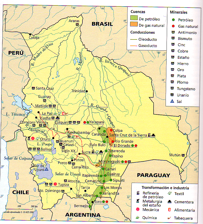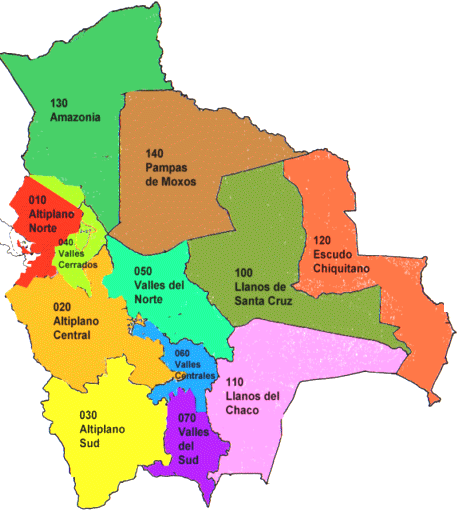 [Vorlage der Karte: Quintanilla de Nogales, Graciela ; Espada de Rosquellas, Rosa ; Montesinos Rollano, Germán: Nueva Geografía de Bolivia 1999. -- 8. ed. -- La Paz : Multimac, 1999. -- Depósito Legal 4-1-280-90. -- S. 208]