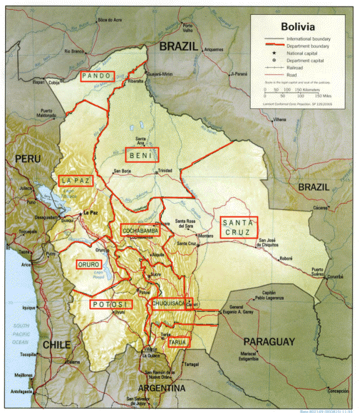 Bolivien ist verwaltungsmäßig in 9 Departamentos aufgeteilt, jedes Departamento ist wieder in Provincias eingeteilt, jede Provincia in Secciones, jede Seccio in Cantones.