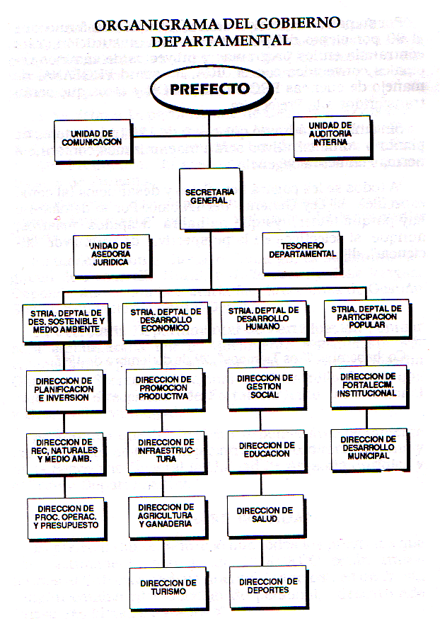 Seit 1995 (Ley se Descentralización) haben die Departamentos selbstständige Regierungen, bestehend aus einem Prefecto (vom Staatspräsidenten ernannt) und einem Consejo Departamental. Die Departamentos haben ein eigenes Budget für ihre Aufgaben (besonders Entwicklung und Planung).