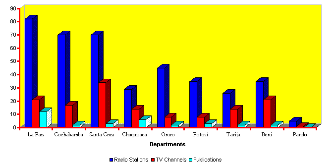 Radio in Bolivia provides the most extensive coverage of all the major forms of media, followed by television, and publications. There are 397 radio stations in Bolivia, 138 Television stations, and 32 publications. In addition, there are three TV cable companies: Video Cable Universal S.A. (with approximately 1045 subscribers), Telecine (with approximately 2,500 subscribers) and Multivision. Bolivia also has one Atlantic Ocean INTELSAT earth station for satellite communication. See Graph for distribution of the radio stations, TV channels, and publications by geographic department. Graph Media Geographic Distribution