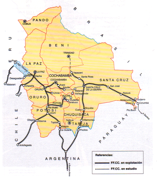 Payer, Margarete <1942 - > ; Payer, Alois <1944 - >: Bibliothekarinnen Boliviens vereinigt euch! = Bibliotecarias de Bolivia ¡Uníos! : Berichte aus dem Fortbildungssemester 2001/02. -- Teil 1: Zur Landeskunde Boliviens. -- 6. Infrastruktur. -- Fassung vom 2002-09-19. -- URL: http://www.payer.de/bolivien1/bolivien016.htm. -- [Stichwort].