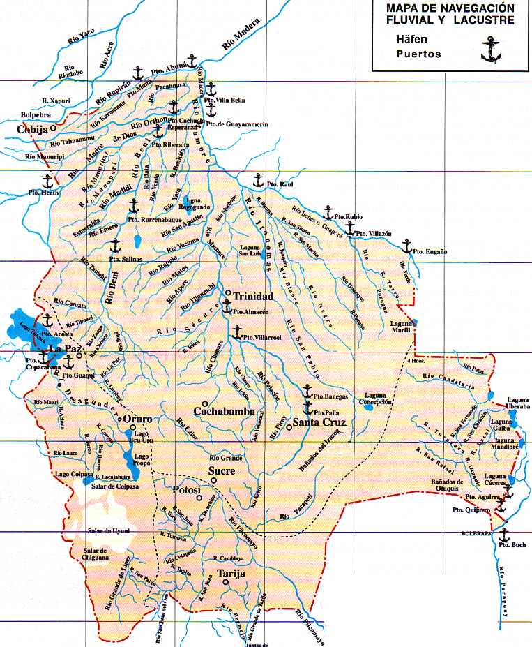 [Quelle: Montes de Oca, Ismael <1934 - >: Geografía y recursos naturales de Bolivia. -- 3. ed., corregida y aumentada. -- La Paz : EDOBOL, 1997. -- Depósito Legal No. 4-1-209-82. -- S. 268, vereinfacht]