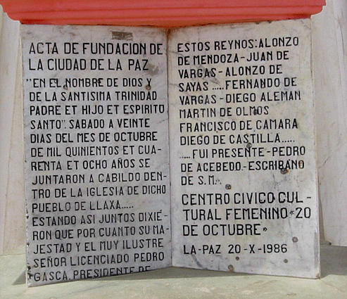 Capitán Alonso de Mendoza (?, Zamora - 1551, Larikaja) legt den Grundstein zur Ciudad de Nuestra Señora de la Paz [Stadt unserer Friedenskönigin] im heutigen Laja. Kurz darauf wird diese Stadt an die Stelle des heutigen La Paz verlegt.