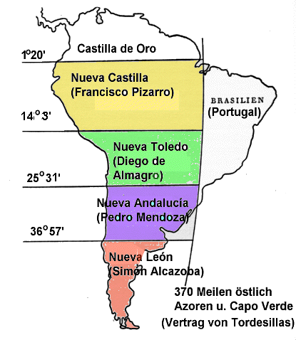 Mit den sog. Capitulaciones de 1534 wird Diego de Almagro (1475/1479, Almagro - 1538, Cuzco) geadelt und erhält das Recht der Eroberung und Erschließung ("licencia para conquistar, pacificar y poblar") im neugeschaffenen Gebiet Nueva Toledo, Pedro de Mendoza erhält die Rechte auf Nueva Andalucia (Nueva Extremadura), Simón Alcazaba die Rechte auf Nueva León.
